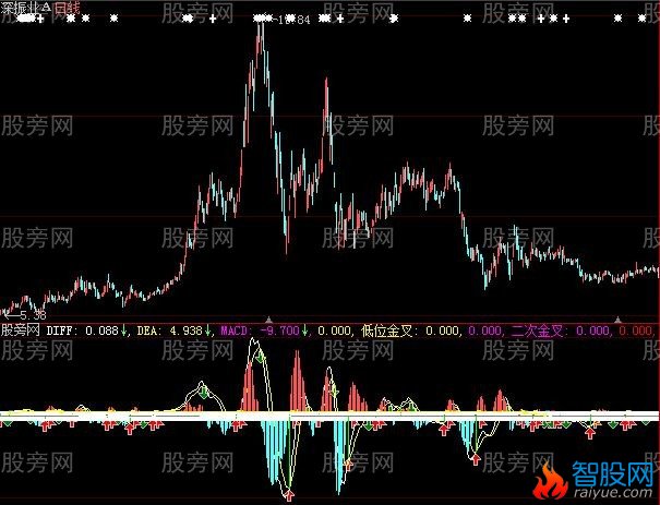底背离:IF(REF(CLOSE,A1+1)>CLOSE AND DIFF>REF(DIFF,A1+1) AND CROSS(DIFF,DEA),40,0),COLORRED,LINETHICK0;